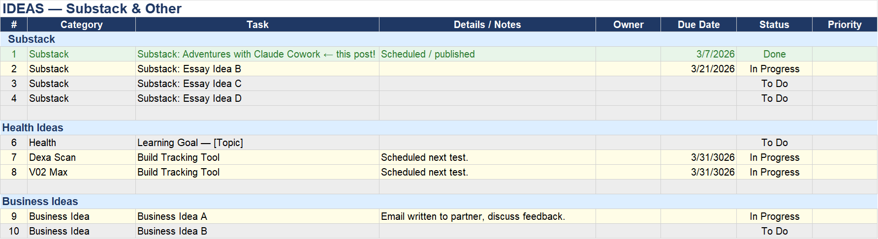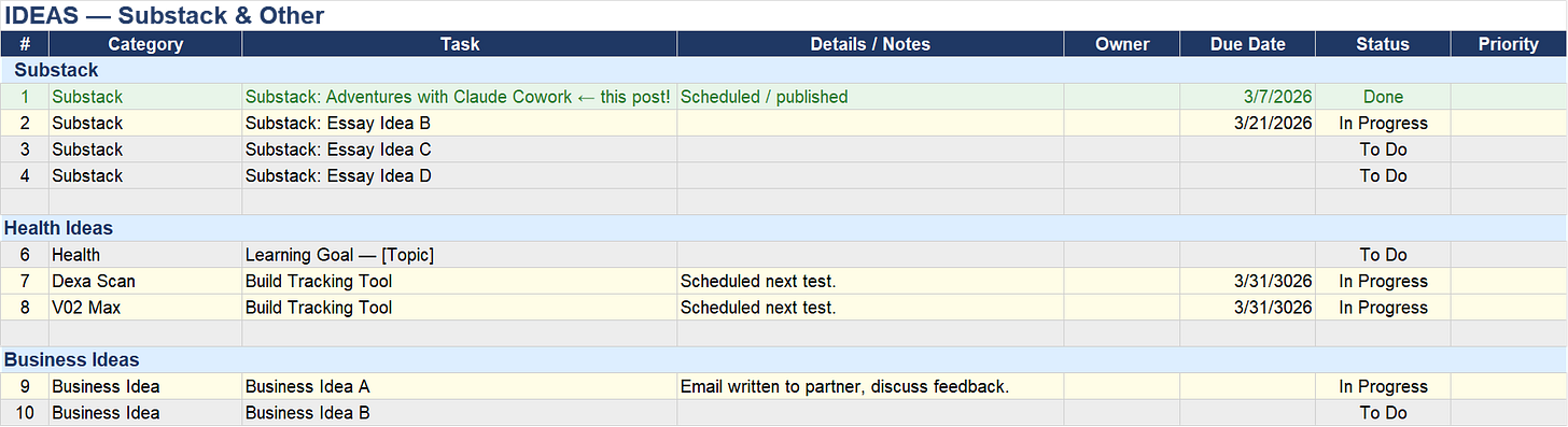 A separate section for ideas — which, if you know GTD, you know capture is the whole game. One file. Every project. Clear status for each item: in progress, done, waiting. The system I’d been meaning to build for years, assembled in minutes.